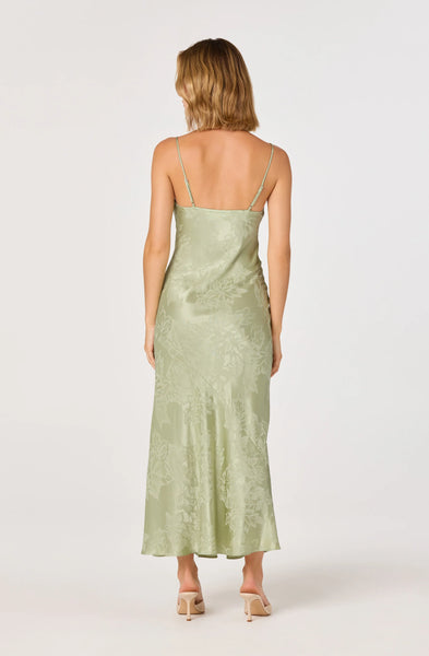 This satin maxi dress features a fluid silhouette and tonal floral jacquard that catches the light. The sweetheart neckline with built-in cups offers elegant structure and support, and asymmetric seam details add a sophisticated touch.
