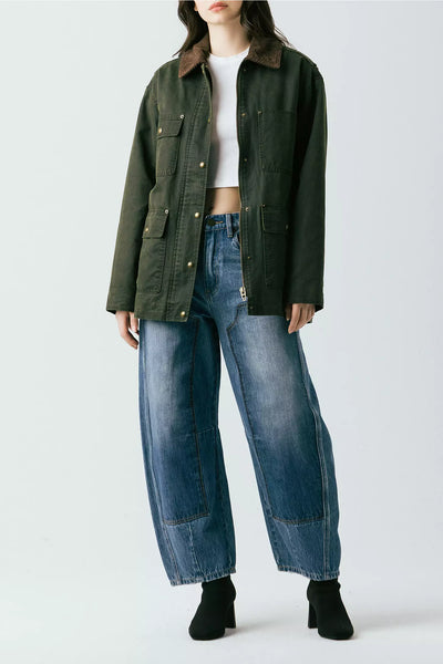 Meet Blank NYC's it-girl barn jacket: oversized coat designed with a structured silhouette with a contrast corduroy collar.